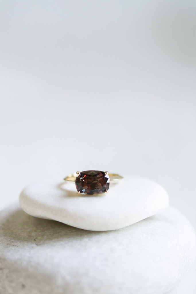 JP EAST/WEST FOUR PRONG CUSHION CUT GARNET RING