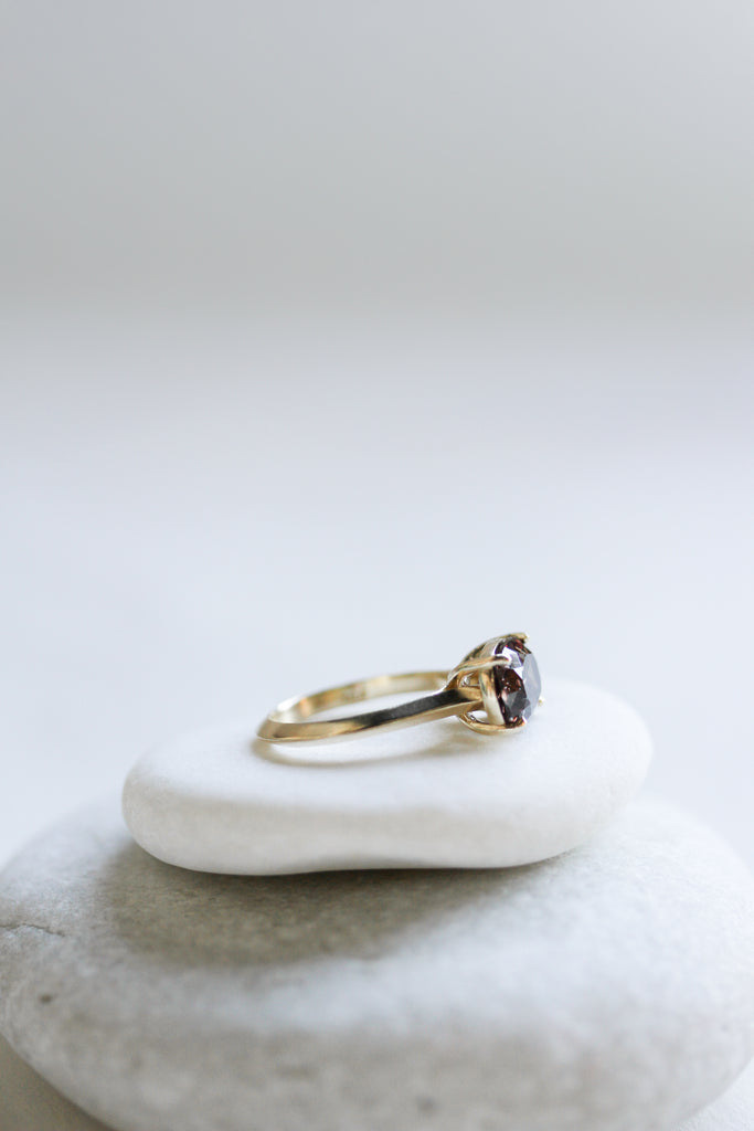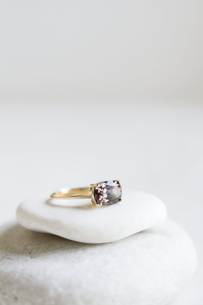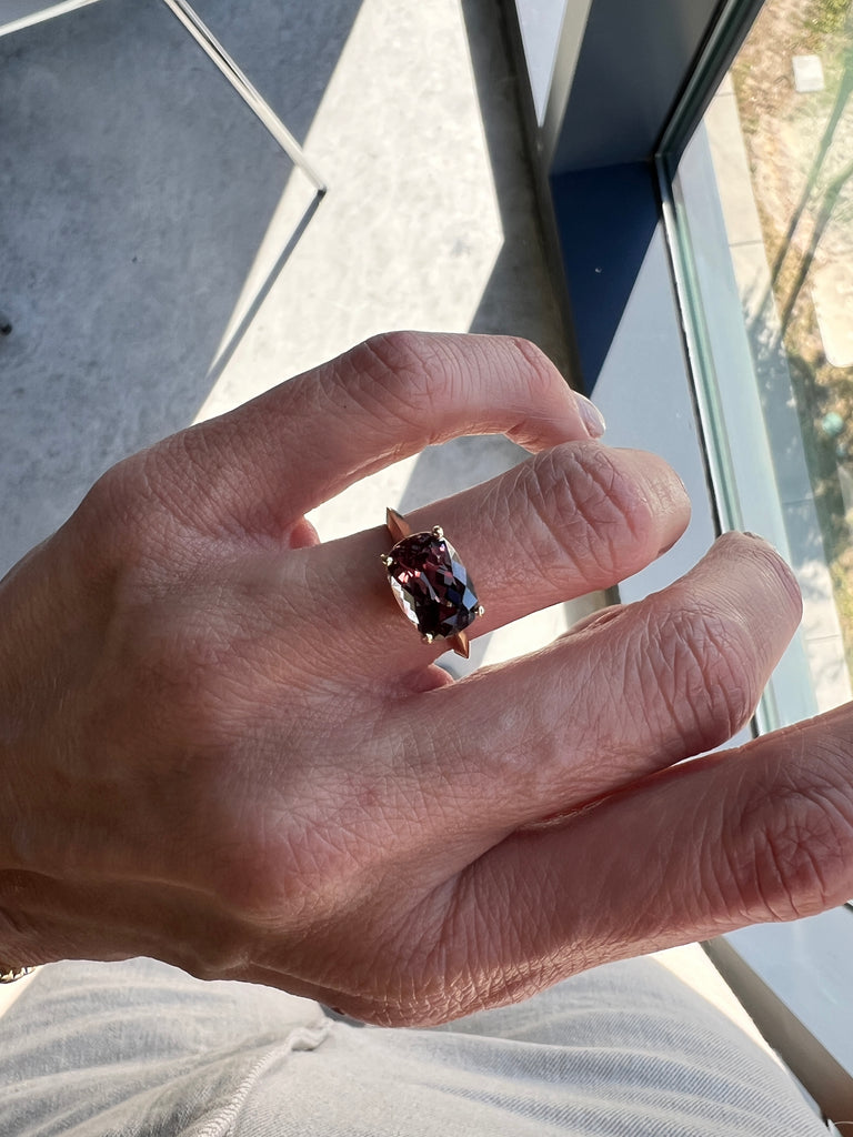 This striking color-changing Kenyan Garnet Ring is unforgettable. Its sleek four-prong setting offers a timeless silhouette, allowing the gemstone to truly take center stage.