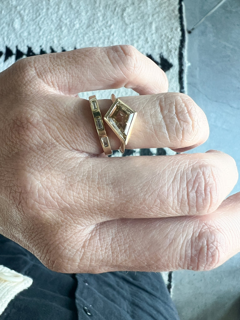 This one-of-a-kind fancy yellow brown kite shaped diamond in a bezel setting and knife edge band creates a clean, unique statement for the bride looking for something truly singular.