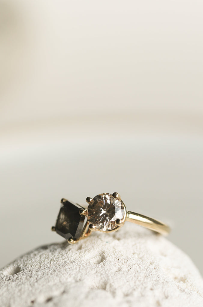 This unique two stone diamond ring has a great balance of shape and color. This ring would make the most perfect unexpected ring for the non-traditional bride or someone looking for a one-of-a-kind right hand ring.