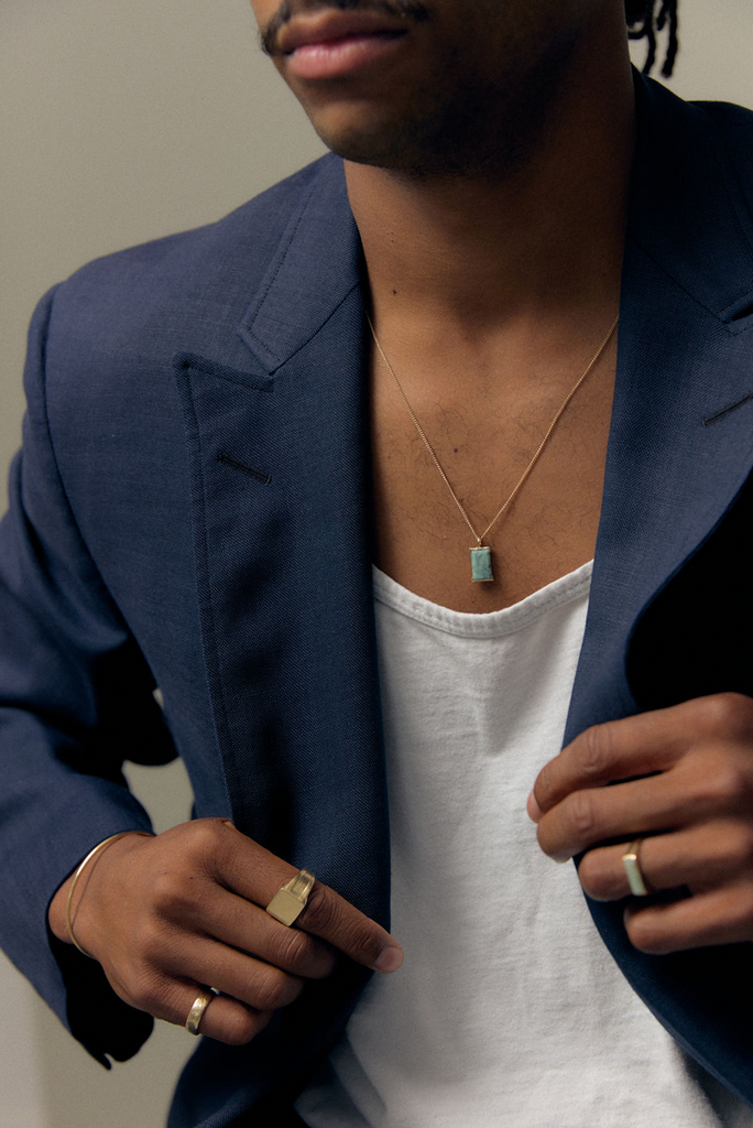 Jane and Kirk Robert Chambers have worked together for many years. Kirk is known as the epitome of style with ease. When he approached Jane about a hole in the jewelry industry for quality men's rings that were cool, she knew this collaboration would be a perfect fit. Years ago, Jane's father had gifted her some rough Jade from his travels to Myanmar, and she knew immediately that cutting those stones for this project would be so special. Jane ended up adding 2 unisex necklaces as well to round out the JPxKR collection. This collection includes a limited quantity of truly one-of-a-kind pieces.