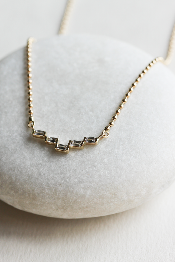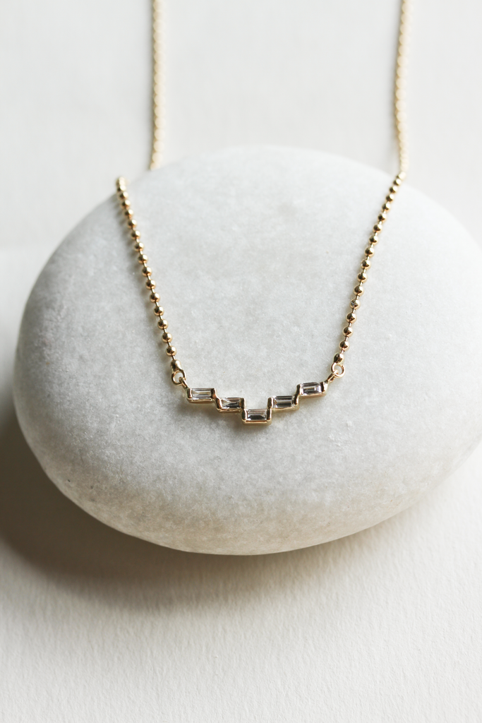 This elegant baguette diamond necklace makes a stunning statement on the ball chain. Perfect for every day or that special occasion, this necklace holds its own.