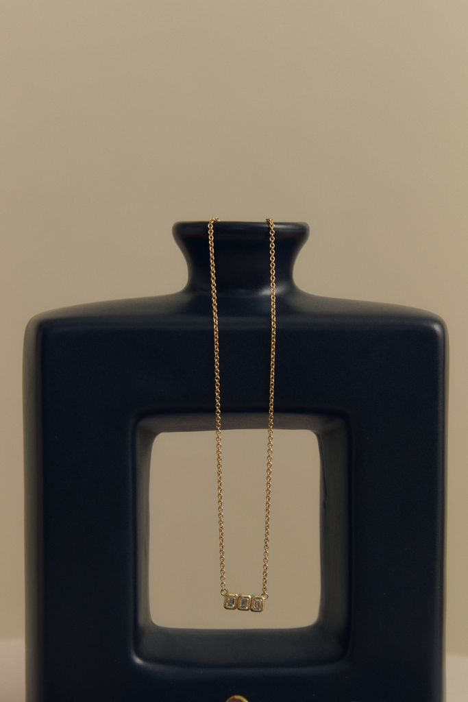 This stunning piece makes a bold statement. The trio of bezel set emerald cut diamonds offer a fresh twist on a classic diamond necklace.