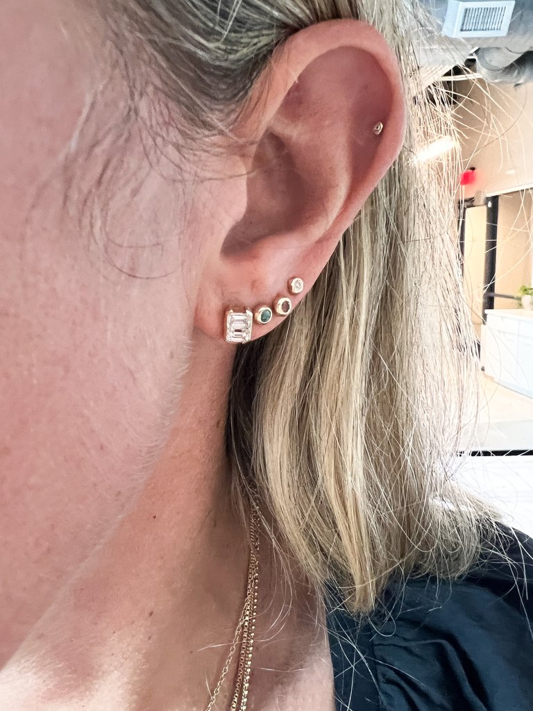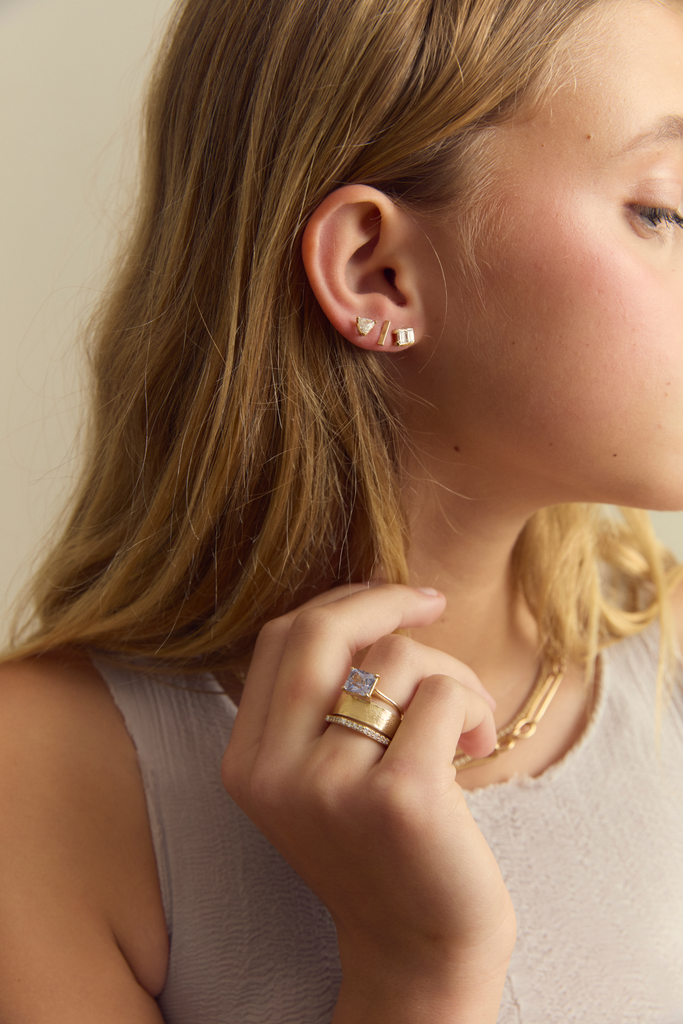 These diamond studs offer a contemporary twist on a classic emerald cut diamond stud. The partial bezel setting allows the diamonds to shine brilliantly while adding a playful, modern touch.