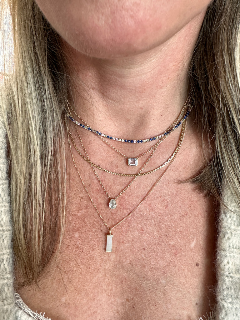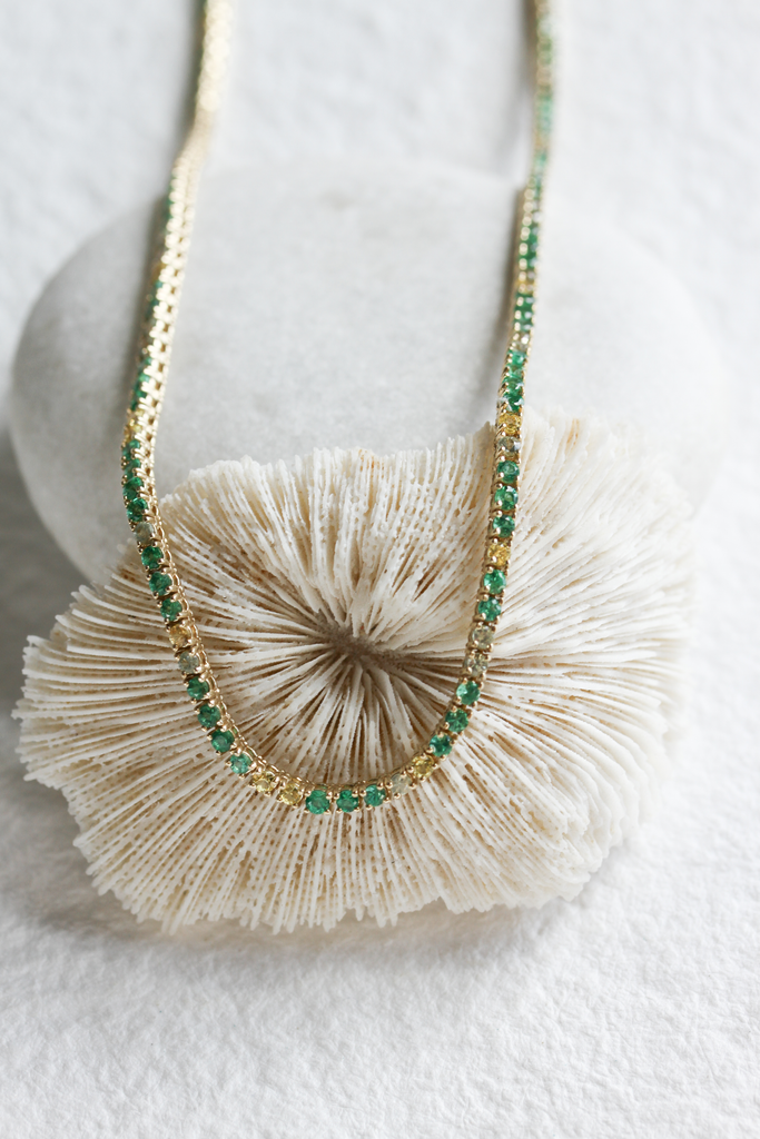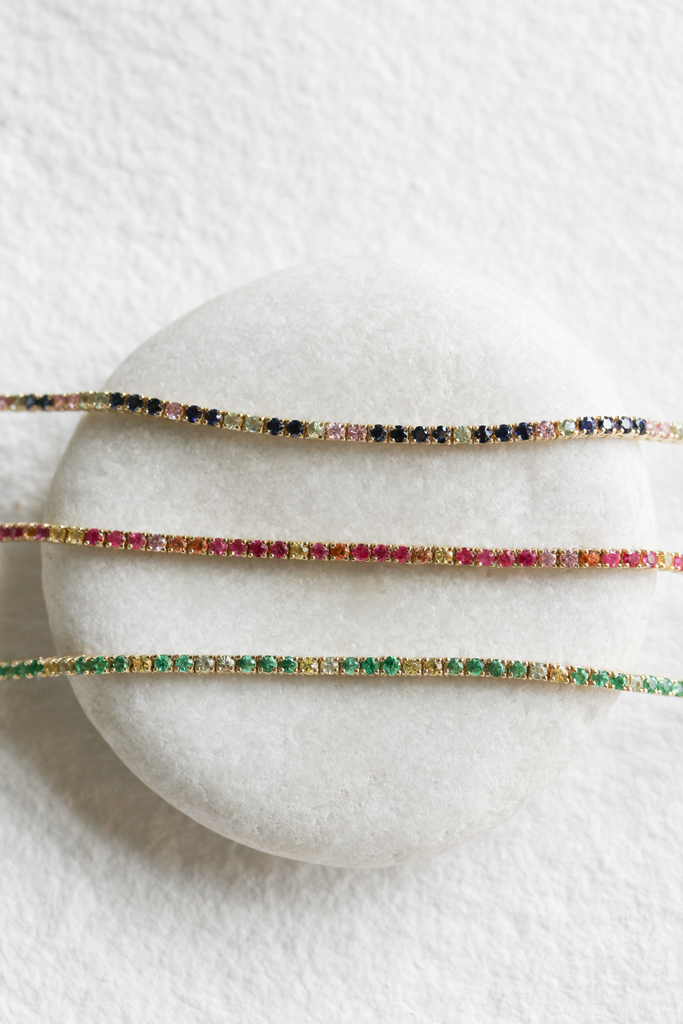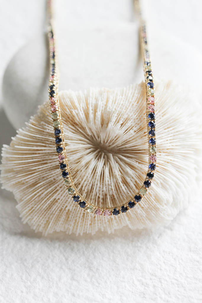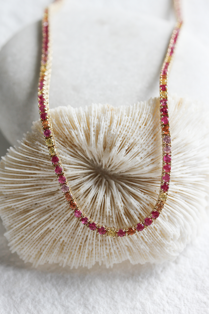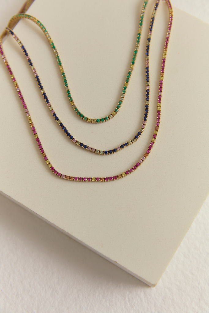 The JP MULTI COLORED LINE NECKLACE is a truly one-of-a-kind showstopper that is sure to turn heads! This stunning piece showcases a stunning array of colors, making it the perfect statement accessory for any outfit.