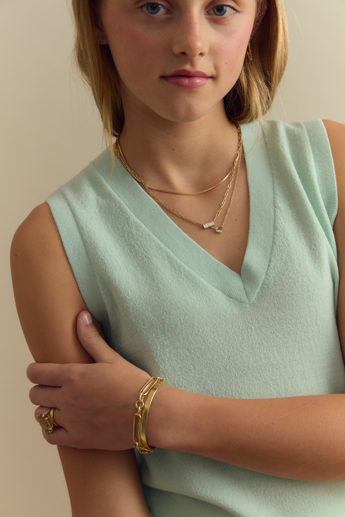 This stunning piece is ideal as a standalone statement. The vertically set baguettes + the cable link chain give this an effortlessly cool piece to be worn every day or for a special occasion.