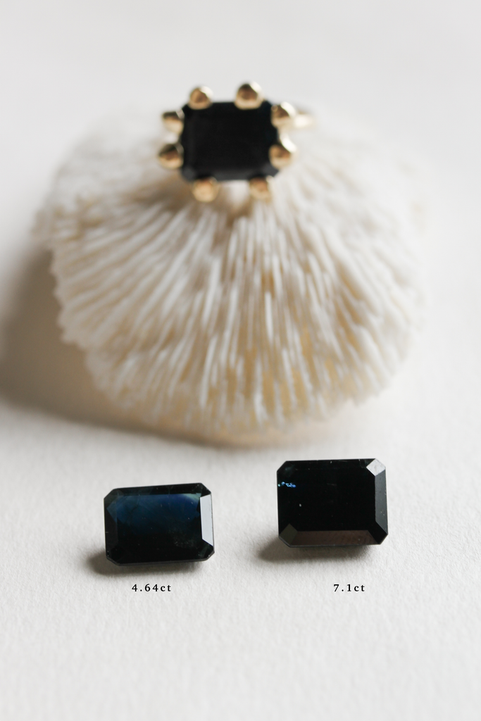 These one of a kind midnight colored stones were hand selected for their uniqueness. Jane's mom had a midnight sapphire ring that Jane admired which makes her drawn to the deep dark color.