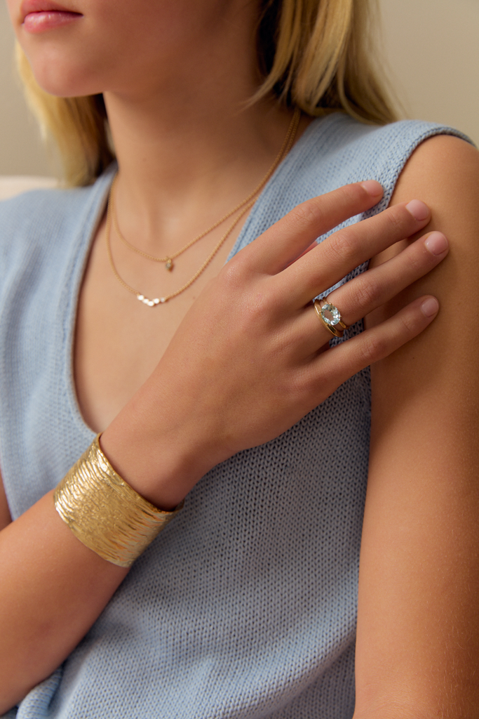 This aquamarine sparkler makes a solo statement. The classic oval shaped stone paired with the textured twig band make for a one-of-a-kind ring.