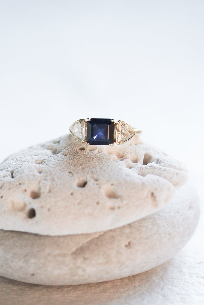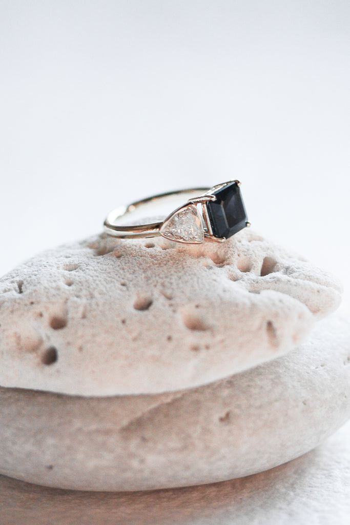 This show stopping ring is one to remember. It is featuring a geometric 2.58ct asscher cut sapphire complemented by two striking trillion diamonds. It truly blends vintage charm with modern elegance.