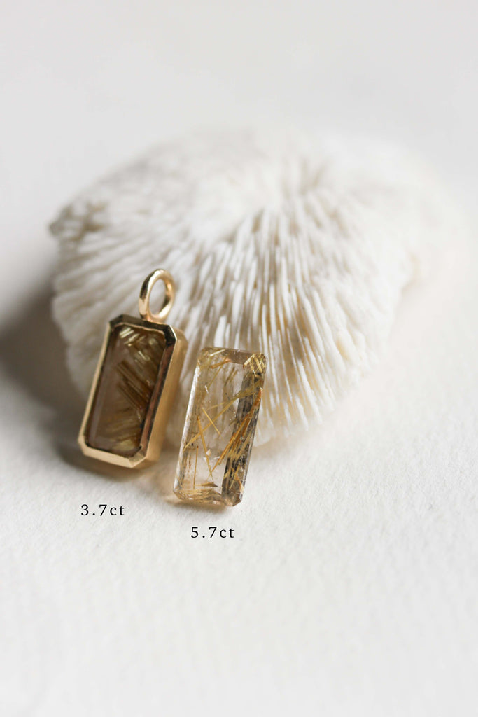 Each emerald cut rutilated quartz is truly one of a kind, with striking natural lines and inclusions that make every stone unlike any other. Set simply in a bezel, this charm lets the quartz’s bold character shine, perfect for layering or wearing solo as a standout piece.