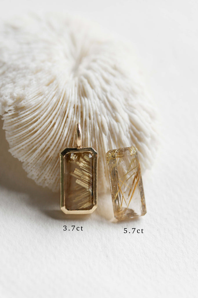 JP ELEVATED BEZEL SET EMERALD CUT RUTILATED QUARTZ GEMSTONE PENDANT