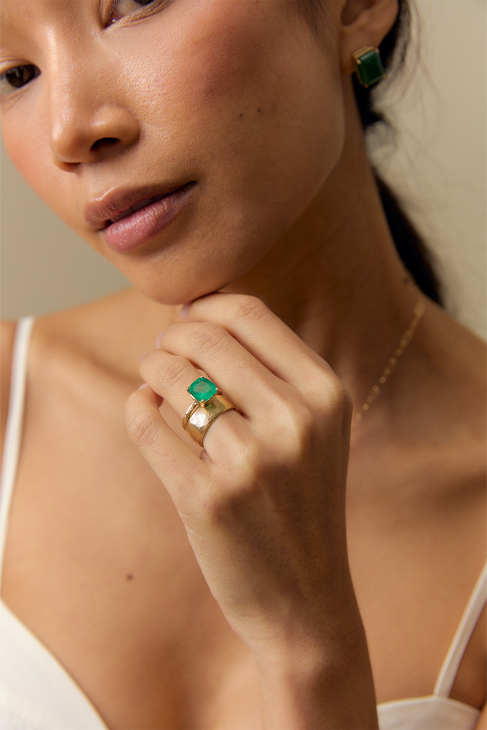 This ring pairs beautifully with JP CUSHION CUT COLOMBIAN EMERALD NECKLACE layered with the JP CABLE CHAIN NECKLACE as a set or complements perfectly when stacked with JP GOLD BANDS