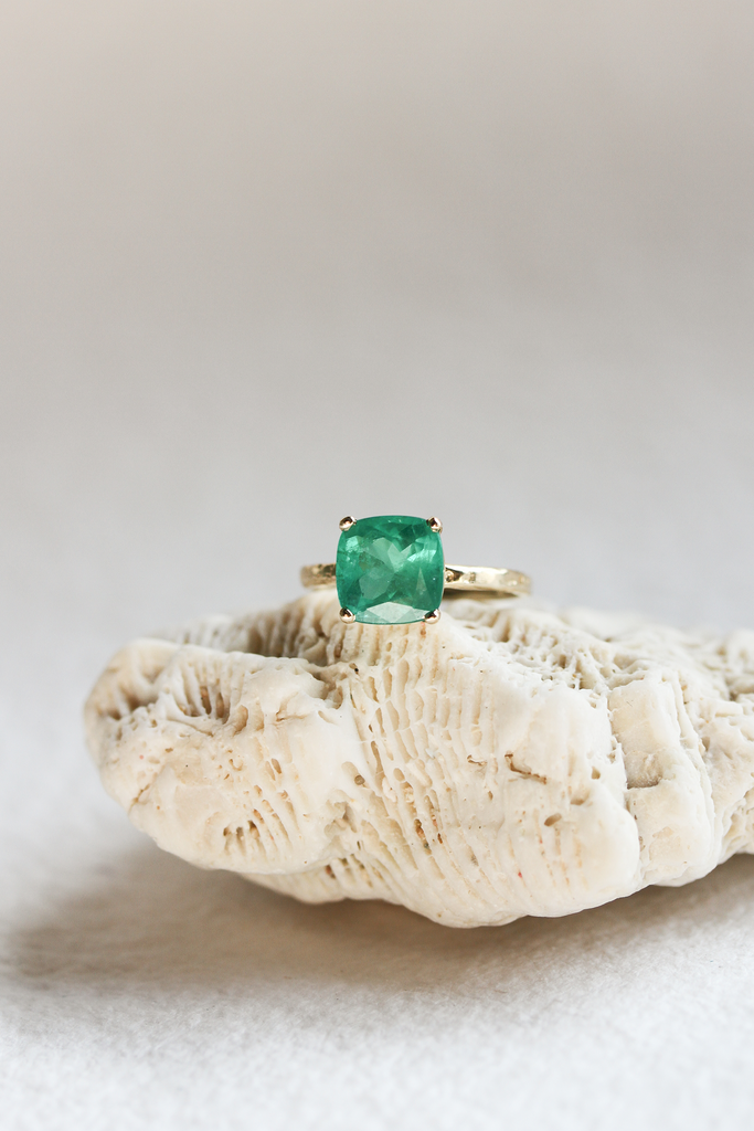 JP FOUR PRONG CUSHION CUT COLOMBIAN EMERALD TWIG RING